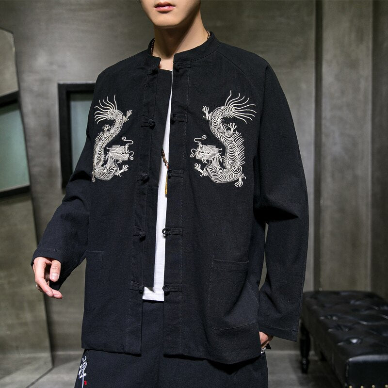 Imaginez... deux dragons élégants, brodés en blanc, qui encadrent votre poitrine, prêts à réveiller le guerrier ou la reine du style qui sommeille en vous. C’est plus qu’une simple veste : c’est un symbole, un talisman habillé en coton et lin, prêt à vous accompagner partout.