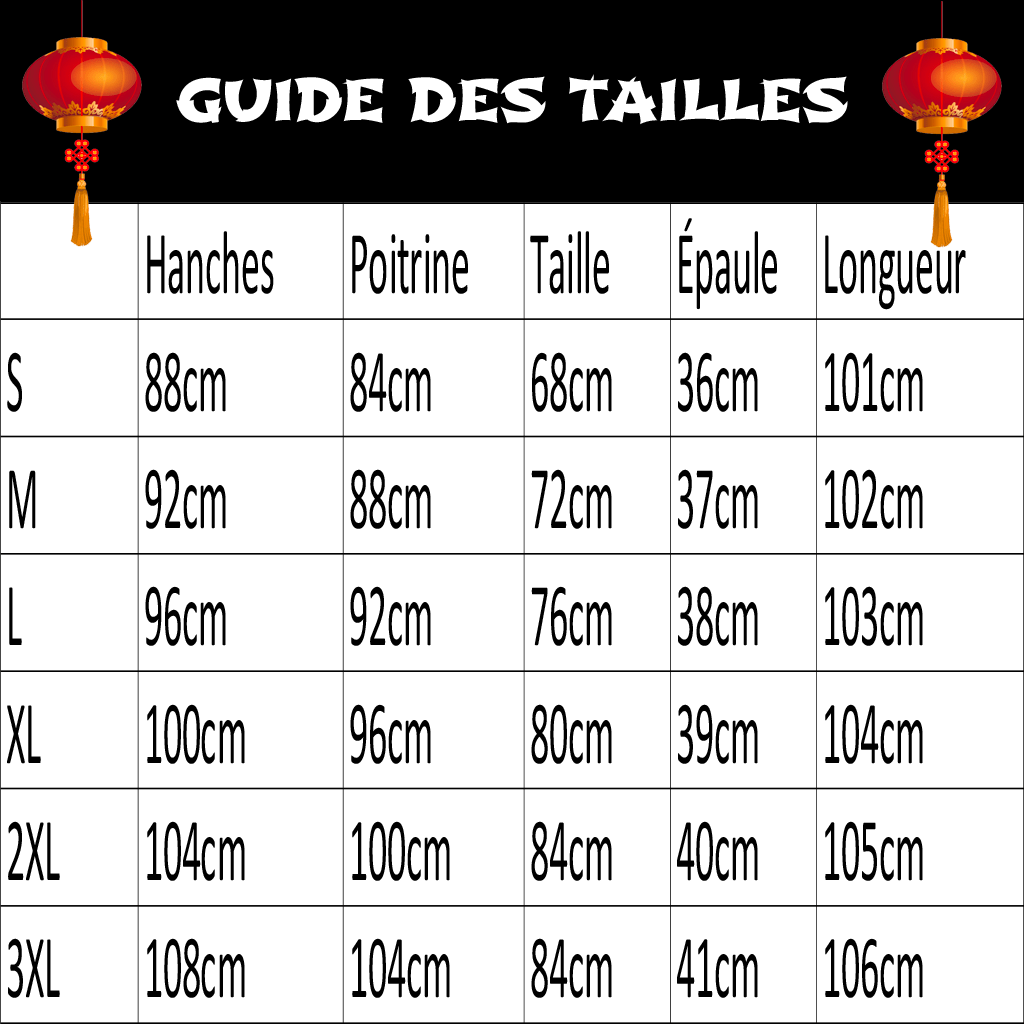La robe chinoise tunique classique est pensée pour être ajustée. Un petit écart peut transformer le confort et l’allure, alors ne jouez pas à la loterie.