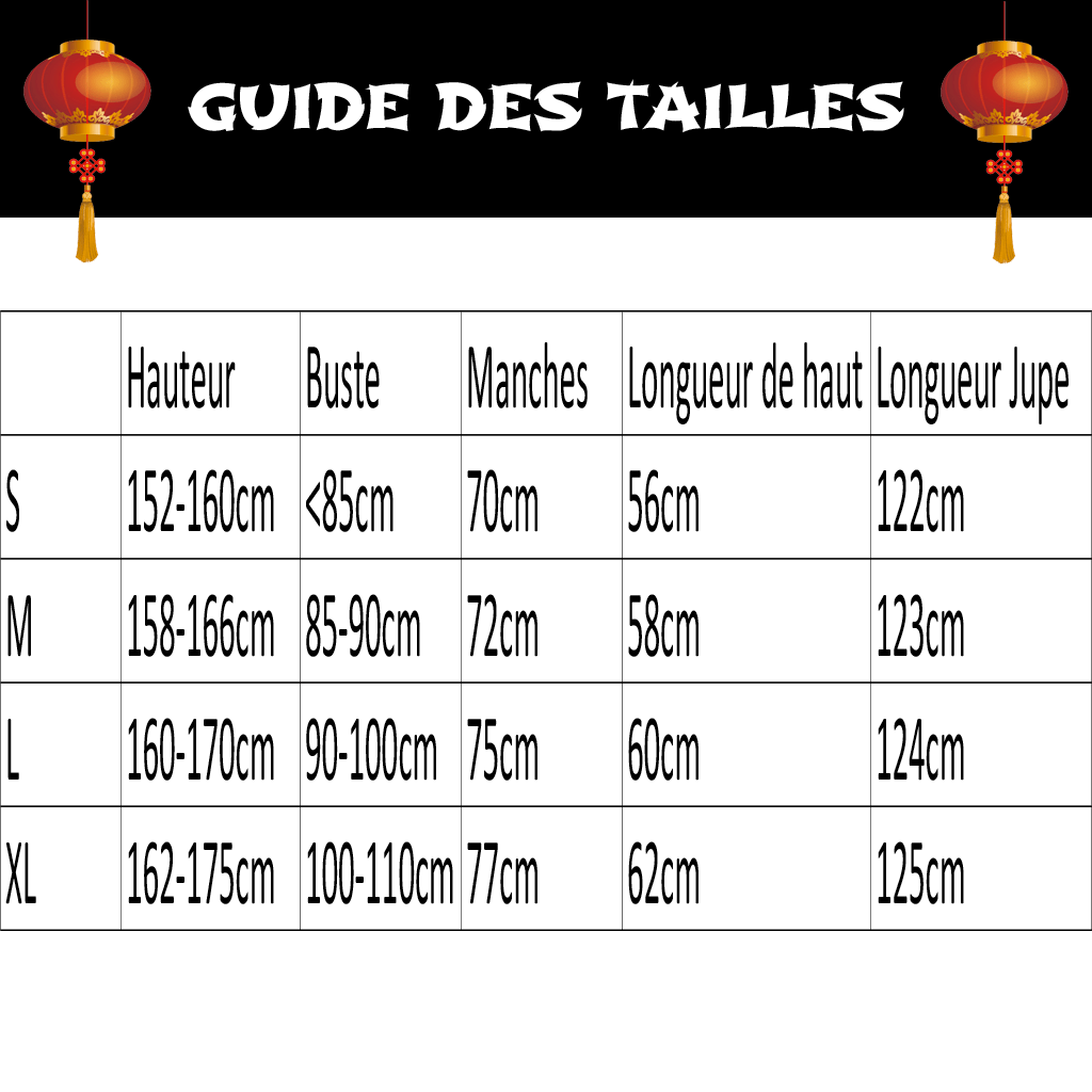 Le Hanfu Kawaii a été pensé pour s’adapter à diverses morphologies grâce à sa matière légèrement élastique. Néanmoins, rien ne remplace un petit coup d’œil au tableau des tailles.